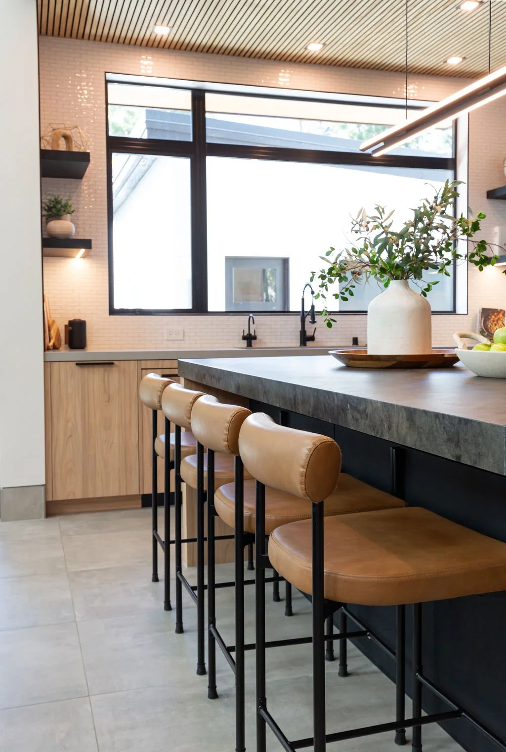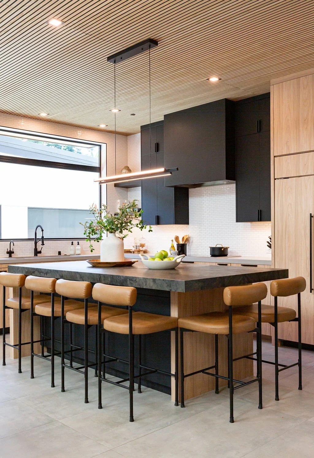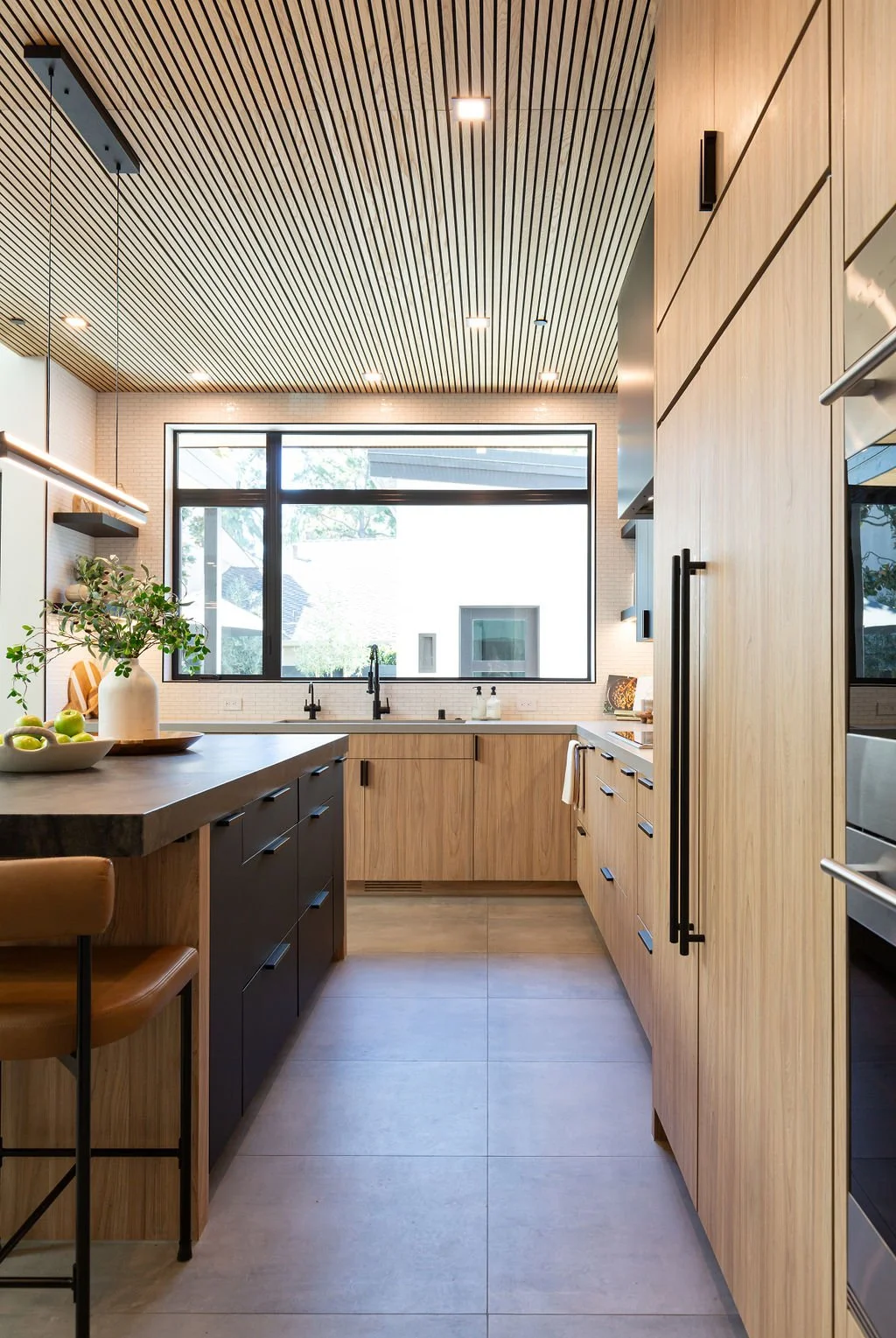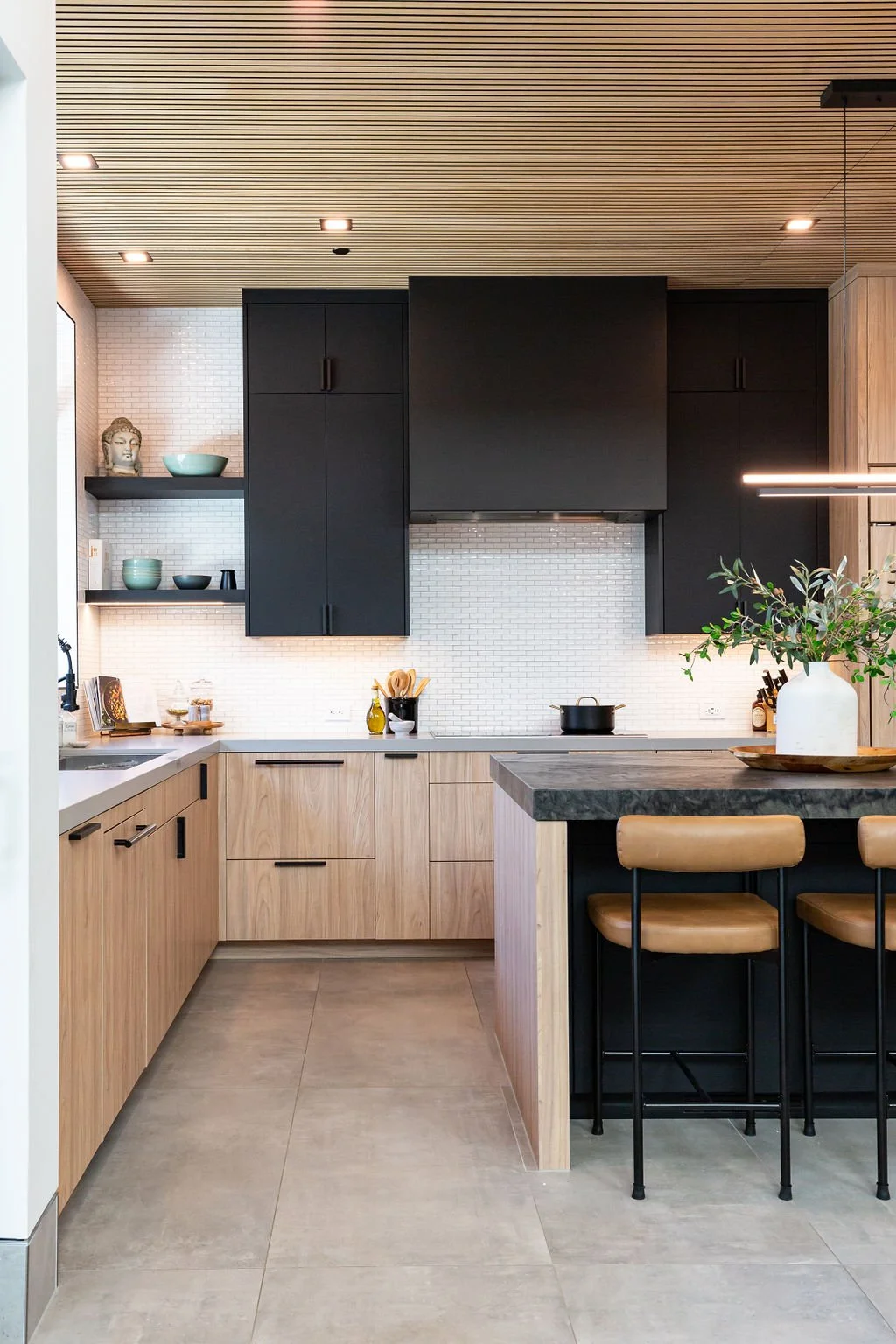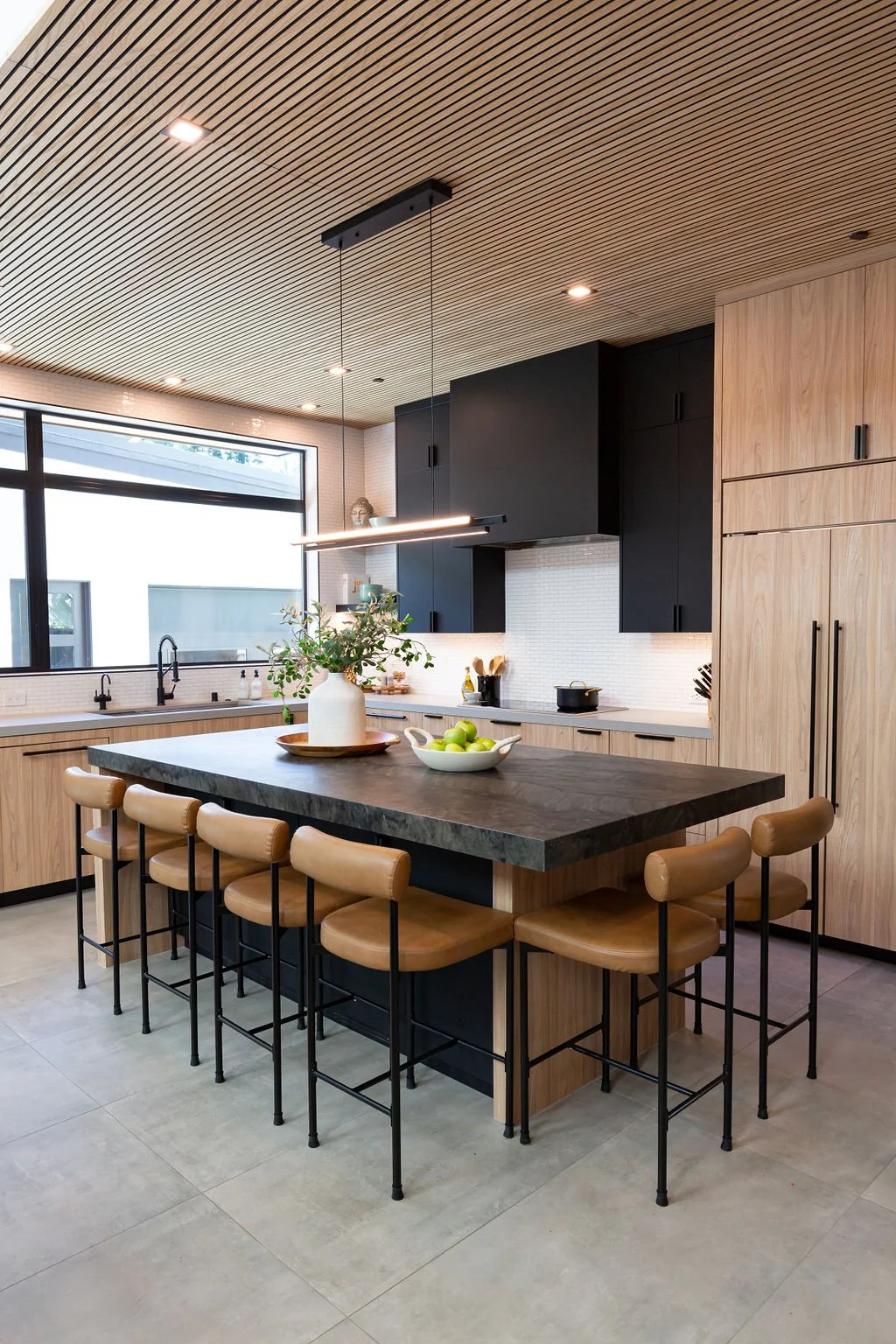 The interior design harmonizes with the exterior, beginning with sleek 24” x 48” concrete-inspired tiles. A striking quartz island countertop, featuring a sophisticated leathered finish, complements warm cabinetry accented with black hardware. The kitchen boasts a unique wooden slat ceiling that contrasts beautifully with the dark grey flooring.