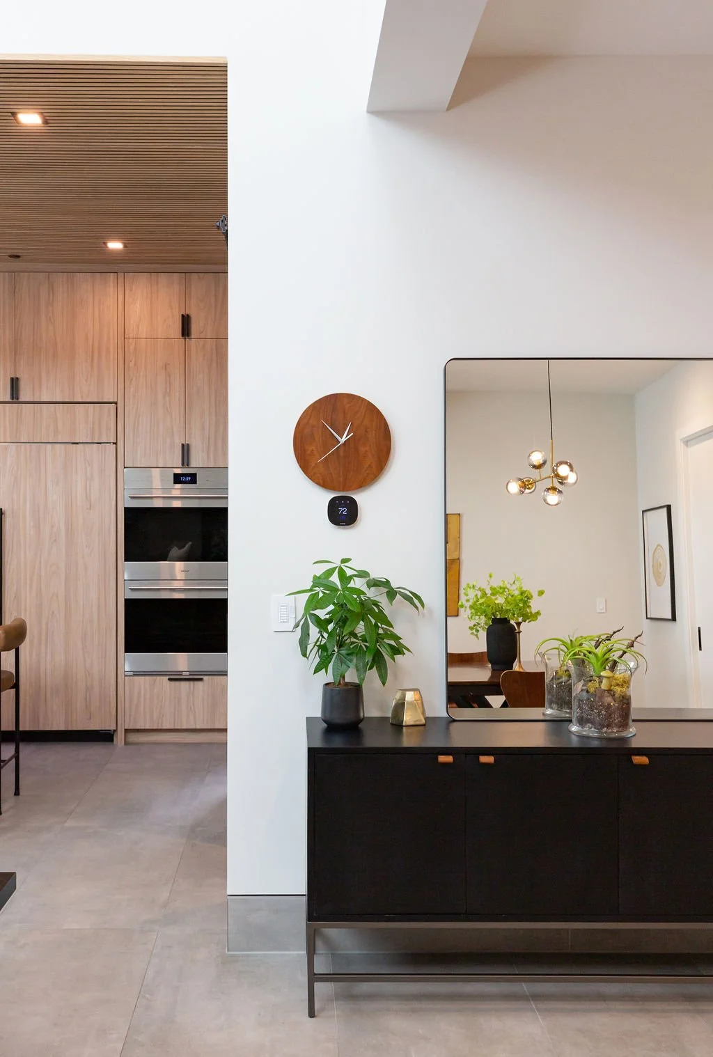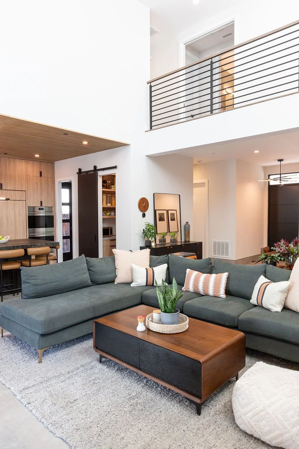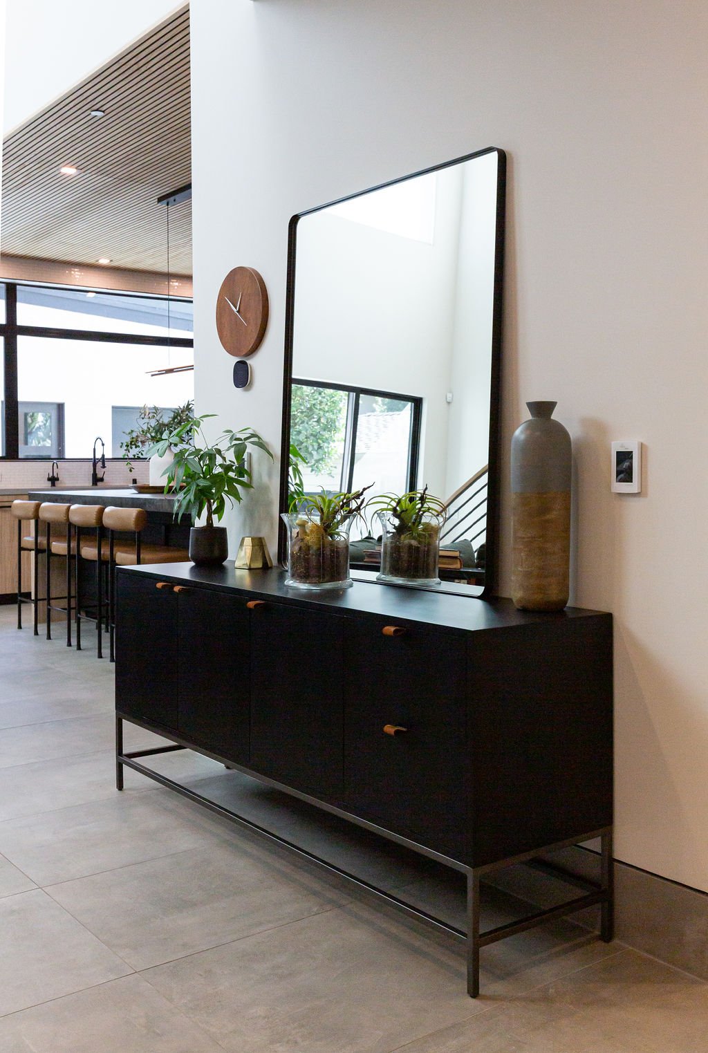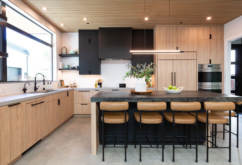 The interior design harmonizes with the exterior, beginning with sleek 24” x 48” concrete-inspired tiles. A striking quartz island countertop, featuring a sophisticated leathered finish, complements warm cabinetry accented with black hardware. The kitchen boasts a unique wooden slat ceiling that contrasts beautifully with the dark grey flooring.
