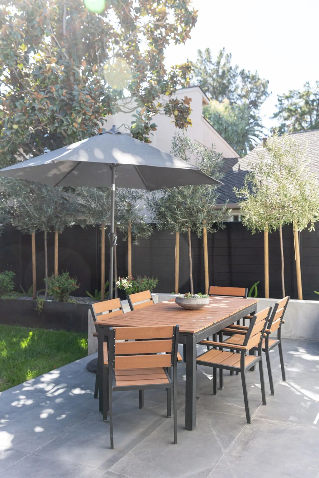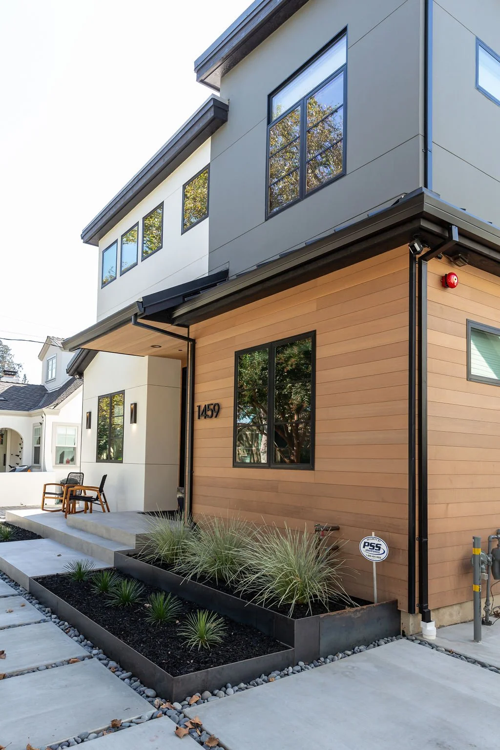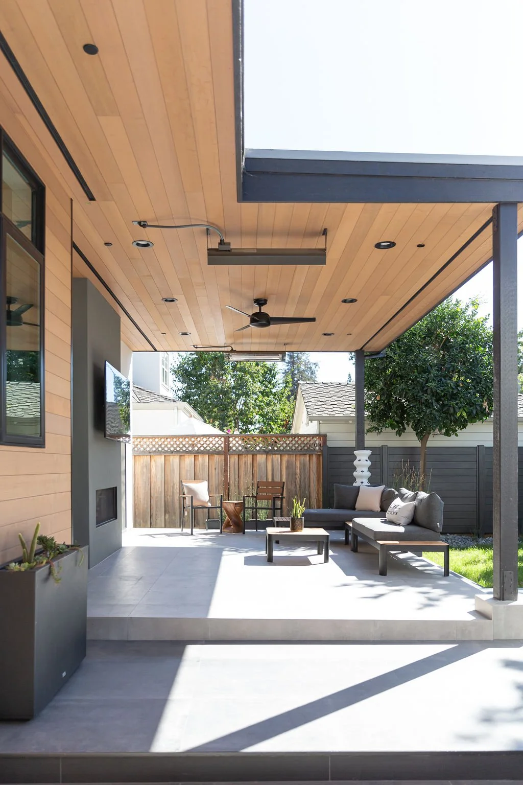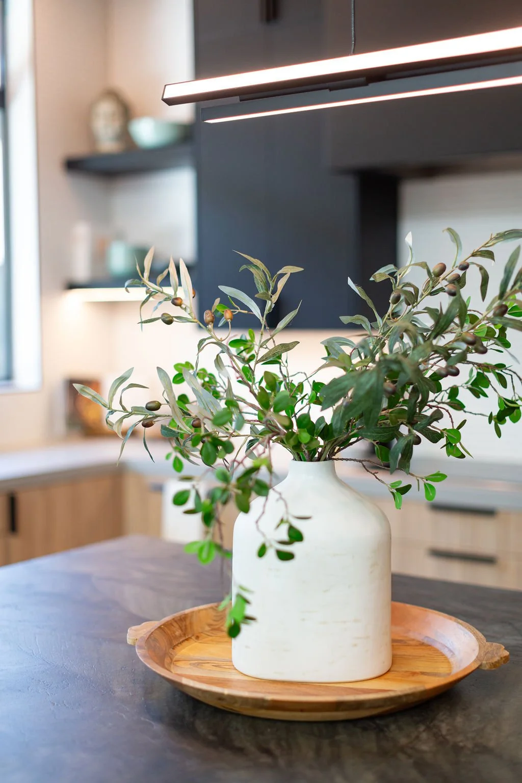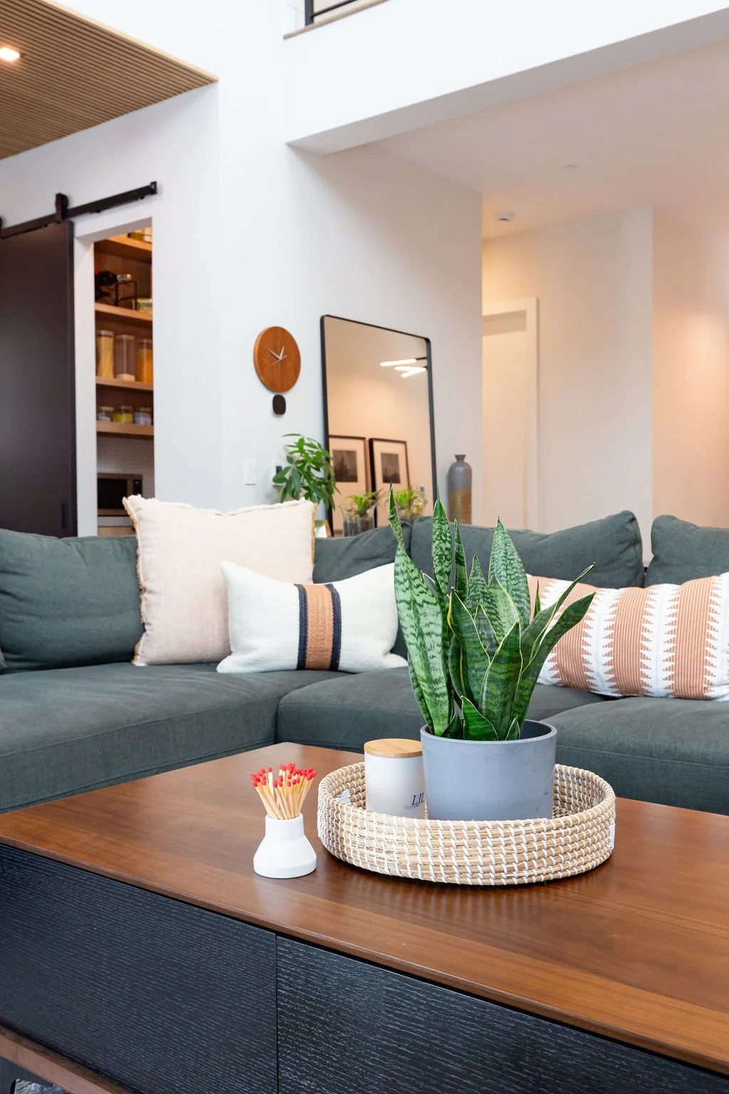 The interior design harmonizes with the exterior, beginning with sleek 24” x 48” concrete-inspired tiles. A striking quartz island countertop, featuring a sophisticated leathered finish, complements warm cabinetry accented with black hardware. The kitchen boasts a unique wooden slat ceiling that contrasts beautifully with the dark grey flooring.