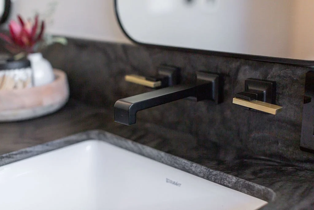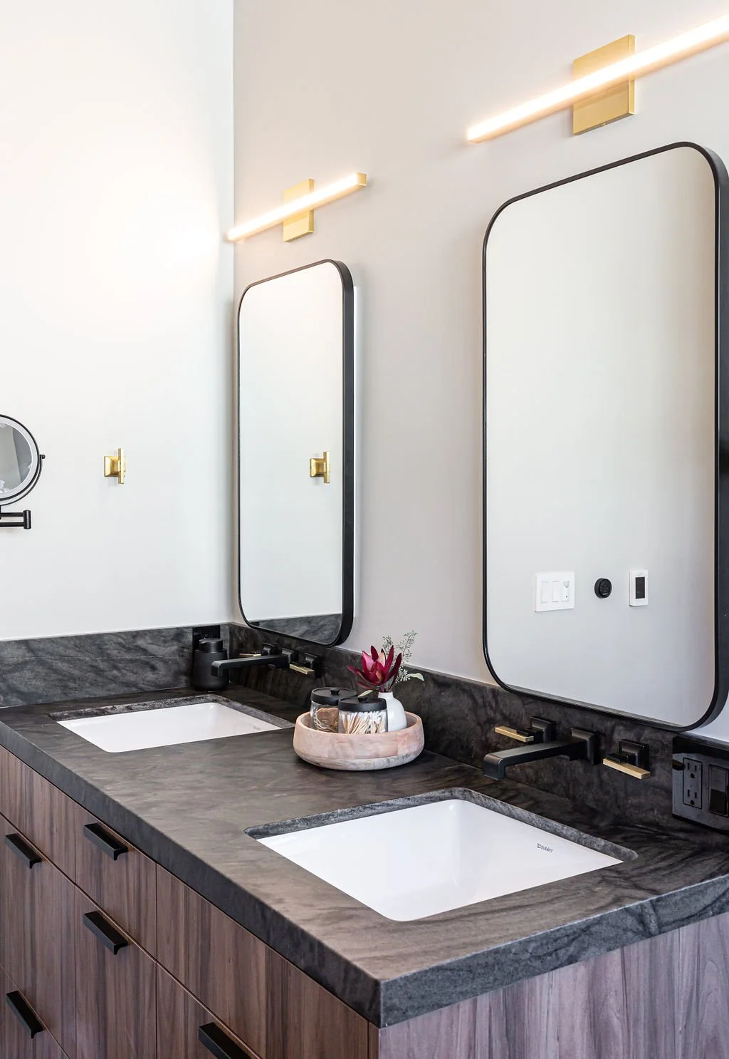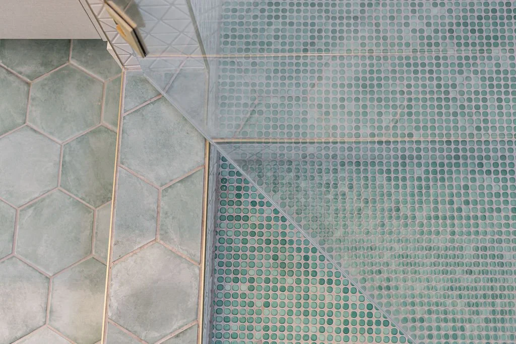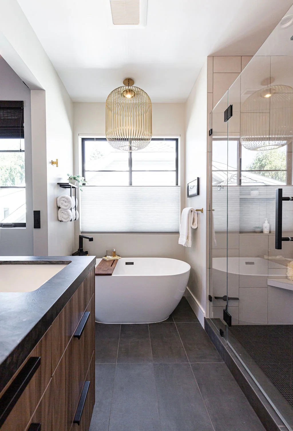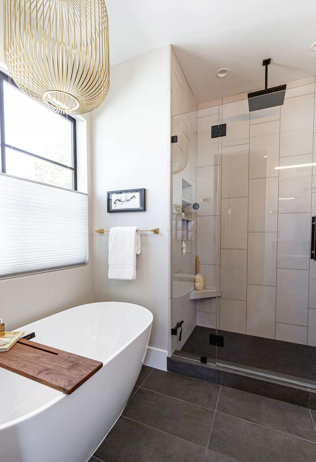 In the master bath, the same stunning quartz from the kitchen island pairs with warm walnut cabinetry. Large-format tiles adorn the shower walls, while penny tiles line the floors. Black plumbing fixtures with brass accents add a touch of elegance, highlighted by a striking brass chandelier above the soaking tub.