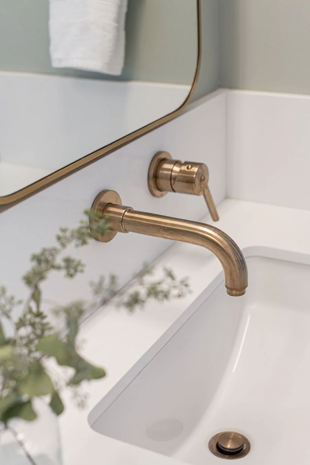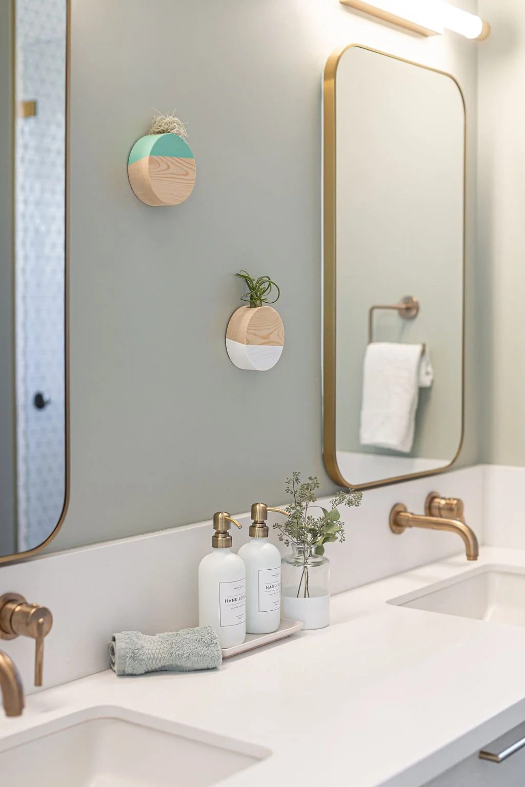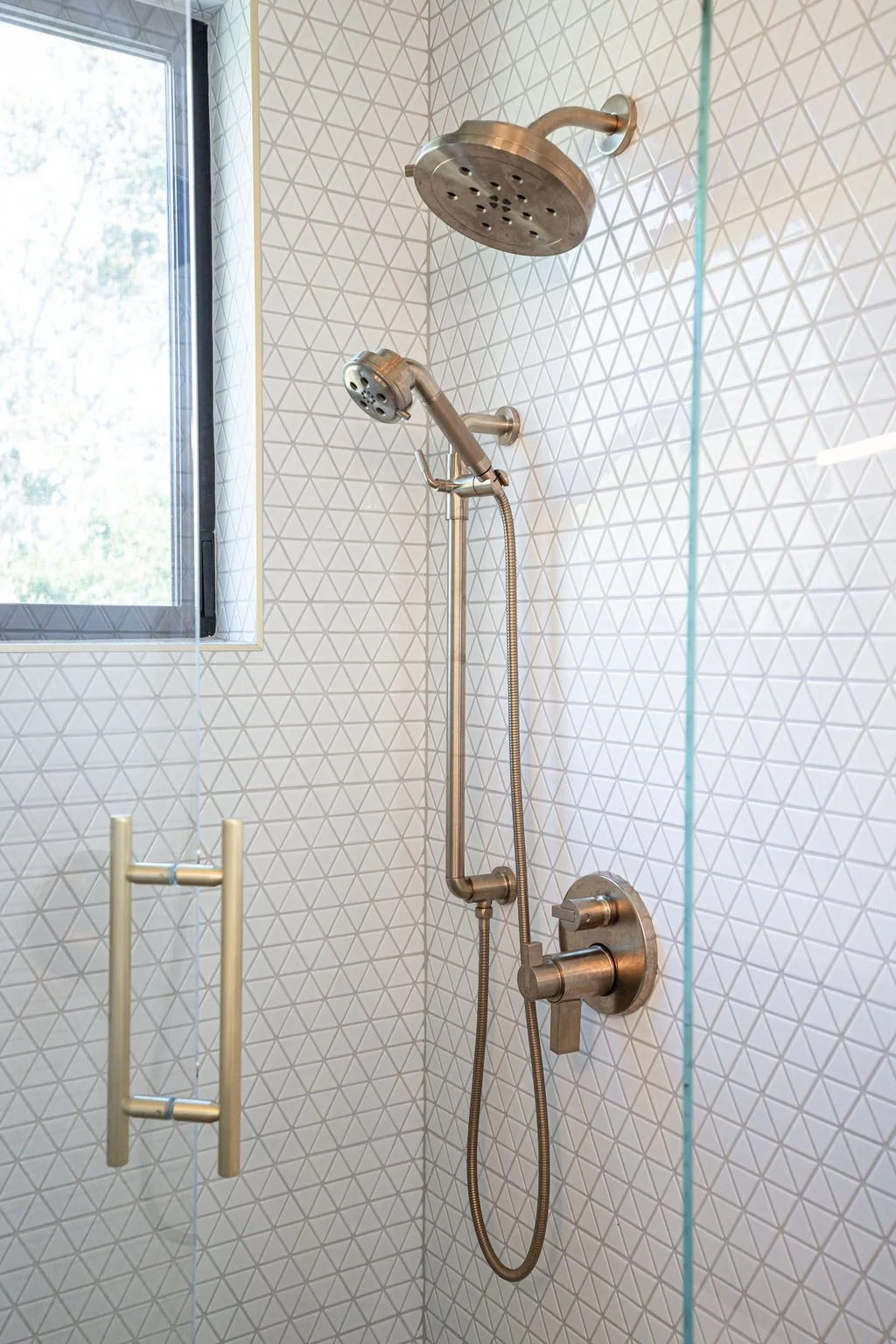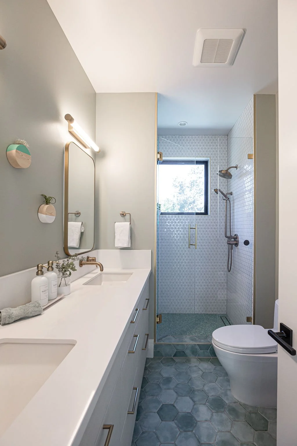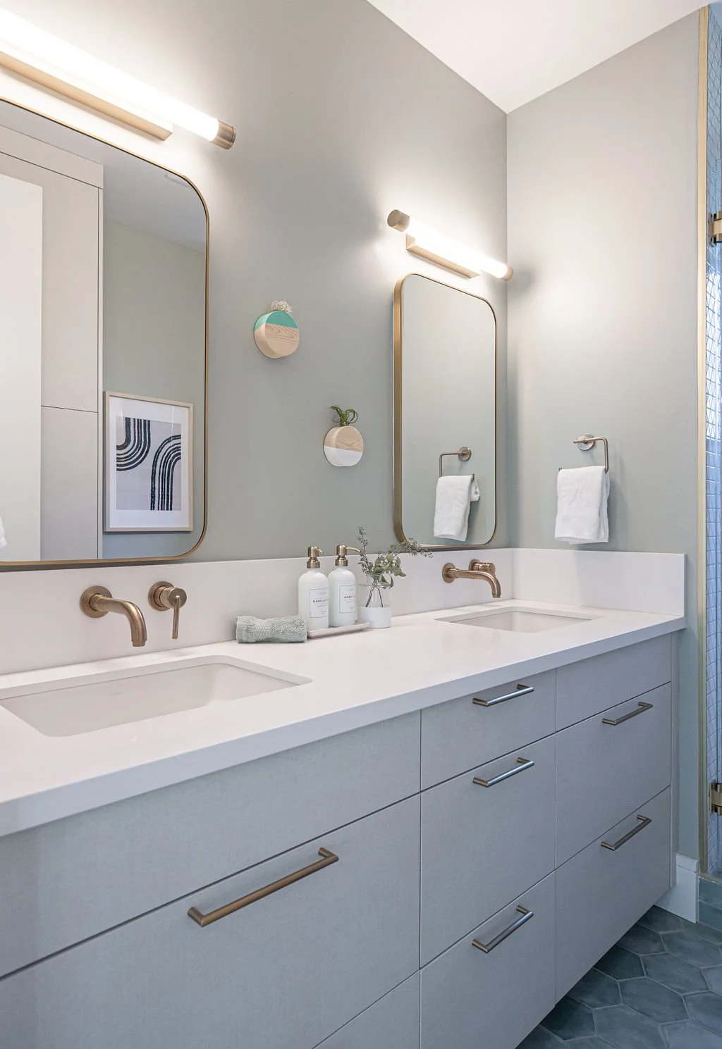 In the master bath, the same stunning quartz from the kitchen island pairs with warm walnut cabinetry. Large-format tiles adorn the shower walls, while penny tiles line the floors. Black plumbing fixtures with brass accents add a touch of elegance, highlighted by a striking brass chandelier above the soaking tub.